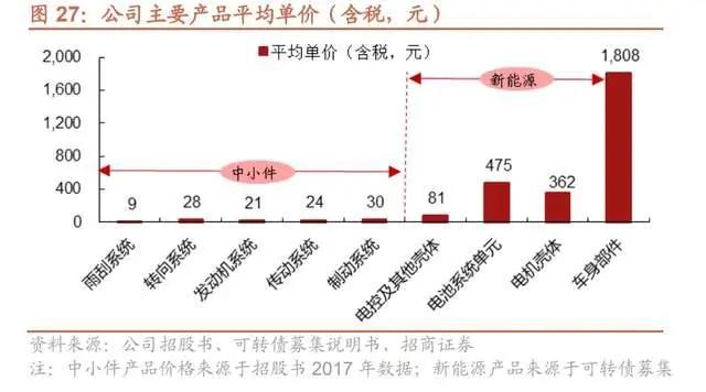 公司雨刮、转向、制动系统等中小件产品由于重量较轻,单车价值量相对较低,据公司招股书 2017 年各业务销量及营收测算,公司传统中小件产品平均单价均处于 30 元以内。而随着新能源业务的发展,公司逐渐开始生产三电系统壳体及车身部件,产品重量明显提升,单价也随之提升明显。