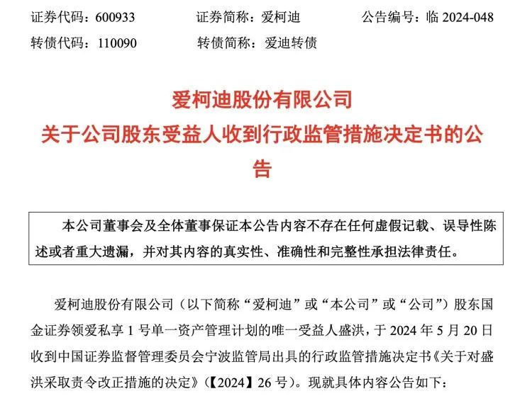 5月20日晚间,爱柯迪公告,公司股东国金证券领爱私享1号单一资产管理计划的唯一受益人盛洪,于5月20日收到宁波证监局出具的行政监管措施决定书《关于对盛洪采取责令改正措施的决定》。