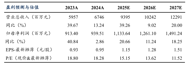 考虑到公司大件占比提升以及收购情况,我们将公司2025年归母净利润的预测下调为11.34亿元,2026年上调为12.61亿元,新增2027年为14.91亿元(2025-2026年前值为12.35亿元、14.54亿元),对应2025-2027年EPS分别为1.15元、1.28元、1.51元(20252026年前值为1.26元、1.49元),市盈率分别为15倍、14倍、12倍,维持“买入”评级。