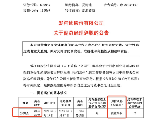 9月15日,爱柯迪(代码:600933.SH)发布公告,公司副总经理张恂杰因工作职务调整辞去现职,并即日起转任副董事长。这一职位自2024年9月盛洪离任后已空缺近一年,如今由87年出生、履历多元的张恂杰补位,颇具看点。