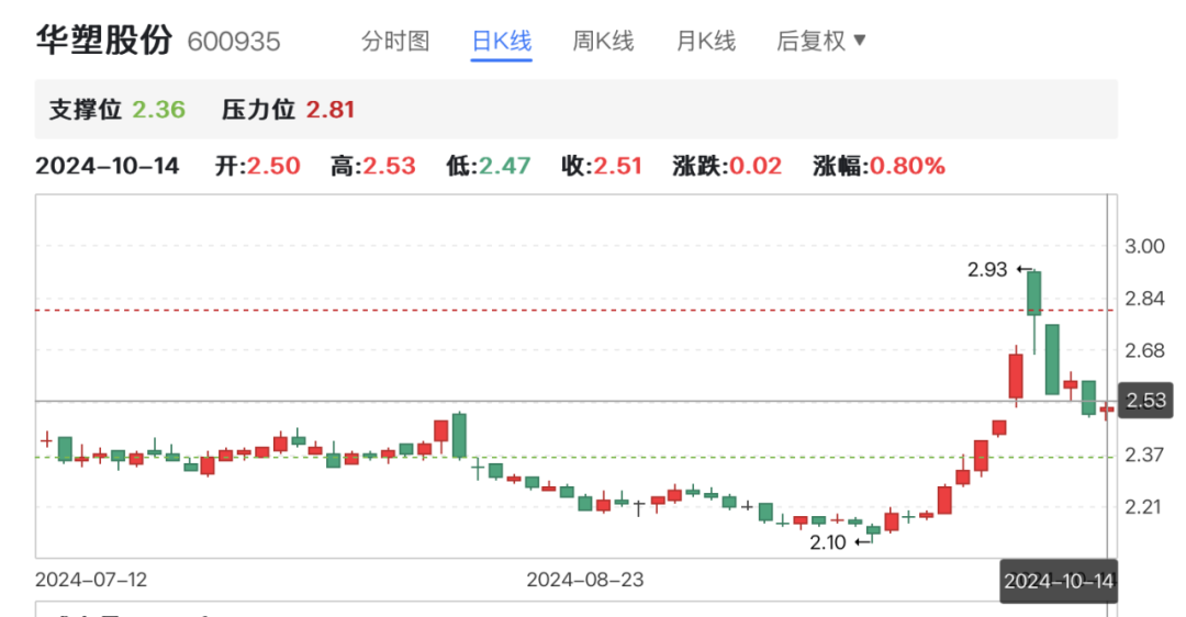 据悉,华塑股份主要从事以PVC和烧碱为核心的氯碱化工产品生产与销售。2021年11月26日,华塑股份在上交所主板上市,公开发行股票数量为3.86亿股,发行价格为3.94元/股。截至2024年10月14日收盘,其股价为2.51元/股(后复权状态),跌破发行价。
