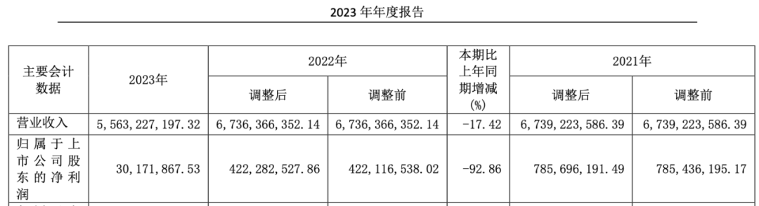 2021年—2023年,其营业收入分别为67.39亿元、67.36亿元及56.63亿元;归母净利润分别为7.86亿元、4.22亿元及3.02亿元,营收、净利润逐年下跌。