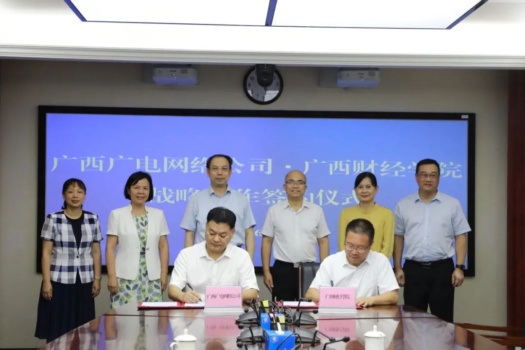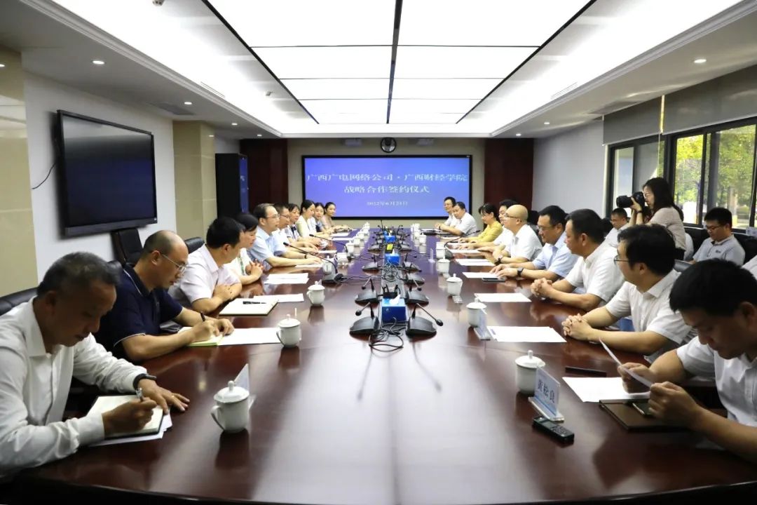 6月21日下午,广西广电网络公司与广西财经学院在南宁签署战略合作协议。广西财经学院党委书记韦春北,广西广电网络公司党委书记、董事长谢向阳出席仪式并致辞。广西财经学院校长夏飞,广西广电网络公司党委副书记、副董事长、总经理罗勇代表双方签约。广西财经学院党委副书记莫柏预,广西广电网络公司党委委员、监事会主席何洁文,党委委员、副总经理涂钧等出席仪式。