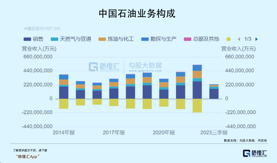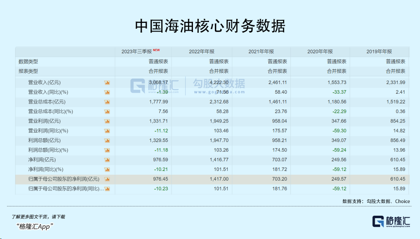 2023年,伴随美欧经济增速放缓以及美联储收紧货币政策等影响,全球油价中枢下移。当年前三季度,营收3068亿元,同比增长-1.39%。归母净利润为976亿元,同比下滑10%。