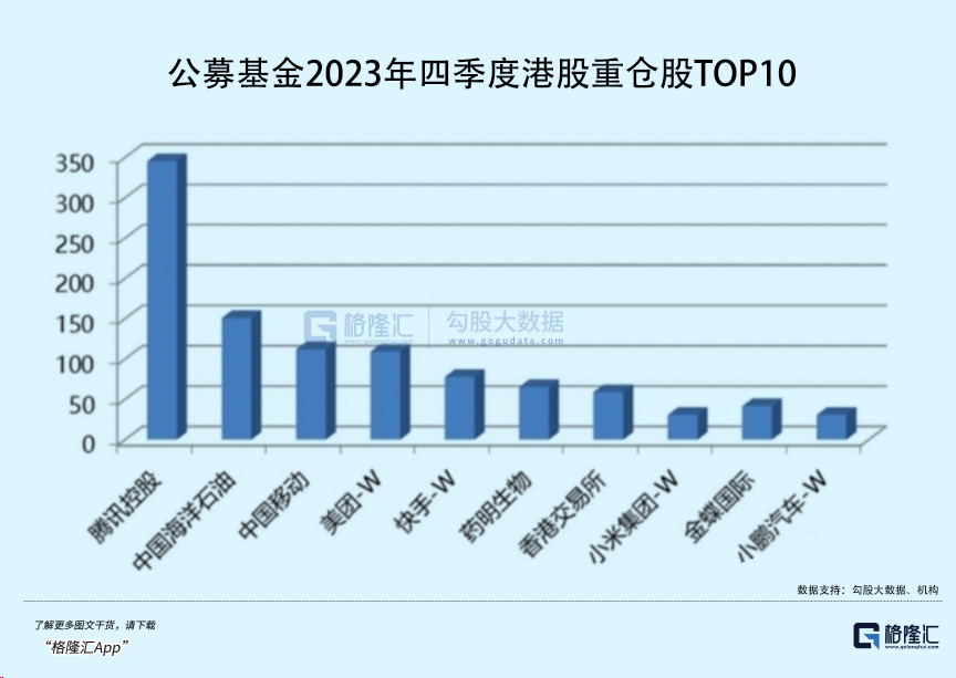 中国海油取得如此傲娇的战绩,也得到了公募基金的追捧。据数据统计,截止2023年四季度,重仓港股公司中,公募基金持仓中国海油150.9亿元,仅次于腾讯的300多亿,高于中国移动、美团、快手、药明生物等龙头。