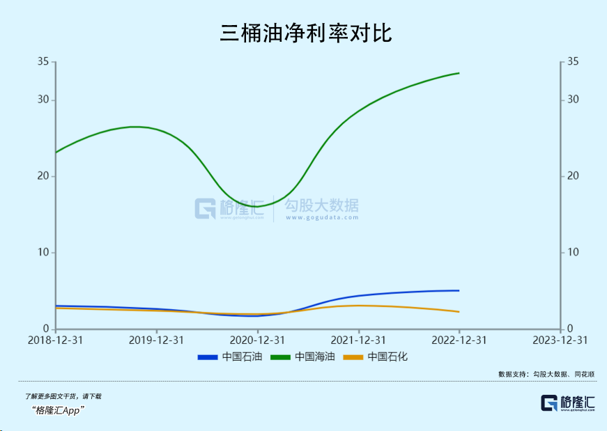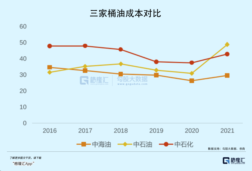 通过以上对比看,中国海油因为成本控制得最好,其盈利能力最强,亦是股价涨幅巨大的核心原因之一。而中国石化因油气业务占比较小、成本中规中矩,且经营体量差过另外两家巨头,其市值最小也不难理解了。