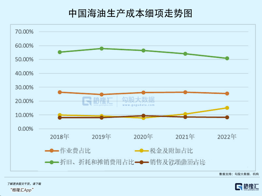 中国海油生产成本主要包括作业费、税金及附加、折旧/折耗和摊销费用、销售及管理费用。其中,折旧/折耗和摊销费用占比最大,近几年均有下降趋势,估计与新技术应用有密切关联。