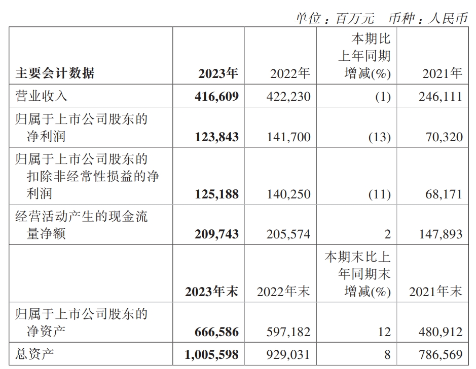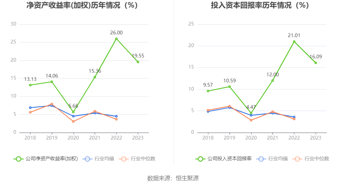 数据显示,2023年公司加权平均净资产收益率为19.55%,较上年同期下降6.45个百分点;公司2023年投入资本回报率为16.09%,较上年同期下降4.92个百分点。
