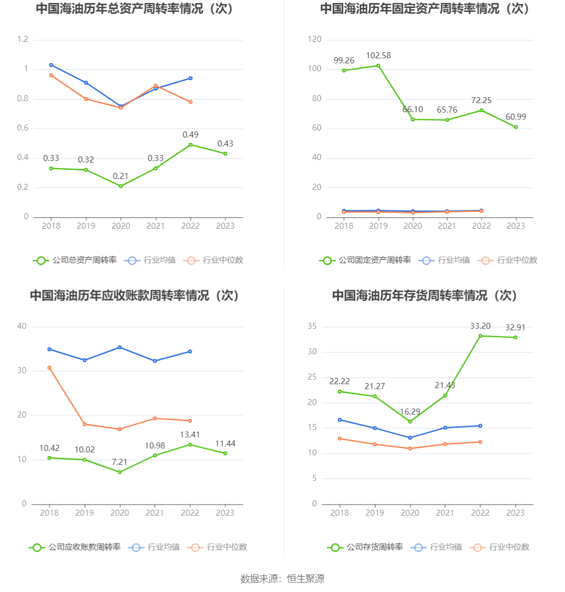 营运能力方面,2023年,公司公司总资产周转率为0.43次,上年同期为0.49次(2022年行业平均值为0.94次,公司位居同行业36/46);固定资产周转率为60.99次,上年同期为72.25次(2022年行业平均值为4.45次,公司位居同行业2/46);公司应收账款周转率、存货周转率分别为11.44次、32.91次。