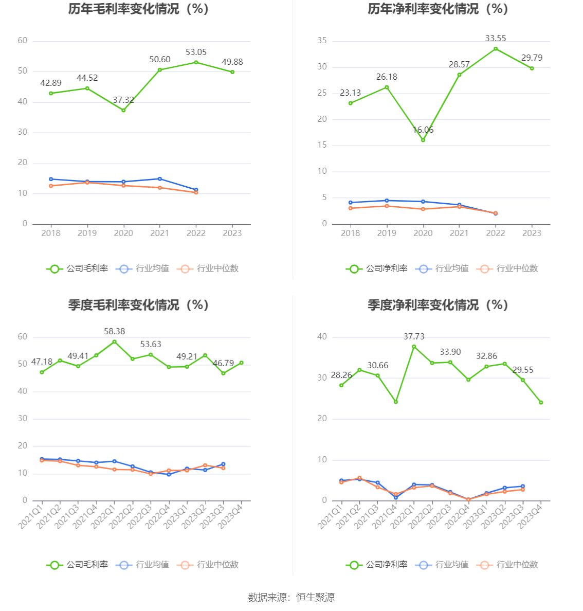 2023年,公司毛利率为49.88%,同比下降3.17个百分点;净利率为29.79%,较上年同期下降3.76个百分点。从单季度指标来看,2023年第四季度公司毛利率为50.68%,同比上升1.58个百分点,环比上升3.89个百分点;净利率为24.07%,较上年同期下降5.56个百分点,较上一季度下降5.48个百分点。