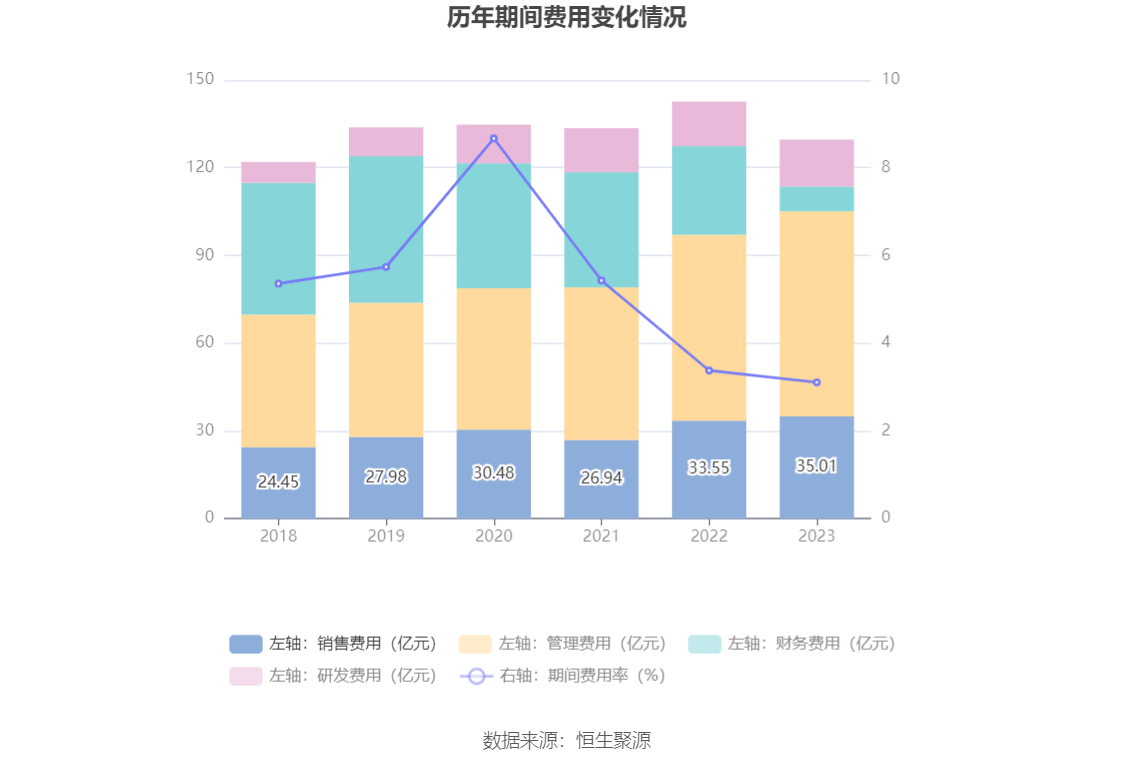 2023年,公司期间费用为129.64亿元,较上年同期减少13.03亿元;期间费用率为3.11%,较上年同期下降0.27个百分点。其中,销售费用同比增长4.35%,管理费用同比增长10.32%,研发费用同比增长5.11%,财务费用同比下降72.07%。