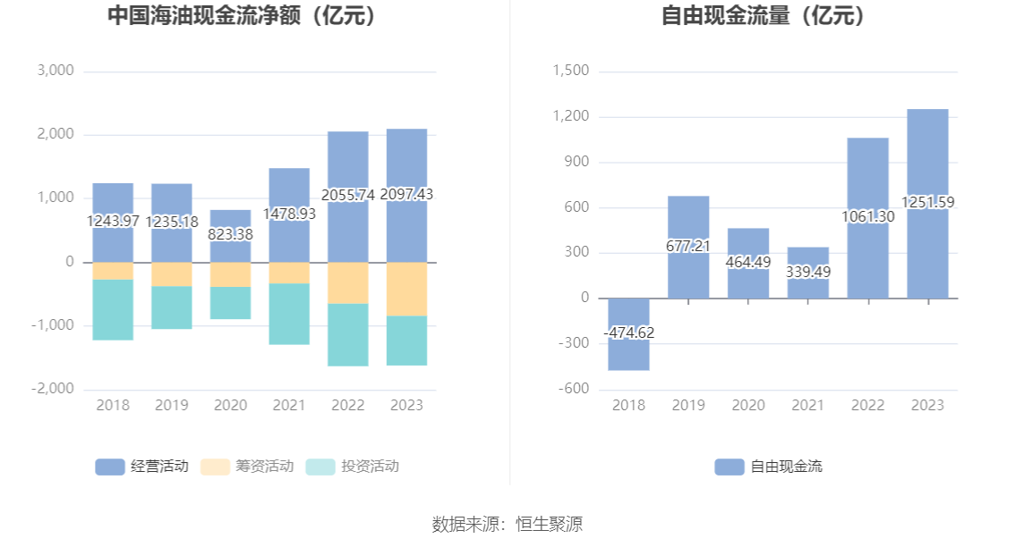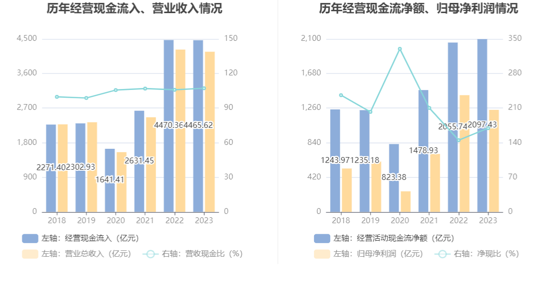 2023年,公司经营活动现金流净额为2097.43亿元,同比增长2.03%;筹资活动现金流净额-842.28亿元,同比减少192.66亿元;投资活动现金流净额-780.95亿元,上年同期为-984.73亿元。
