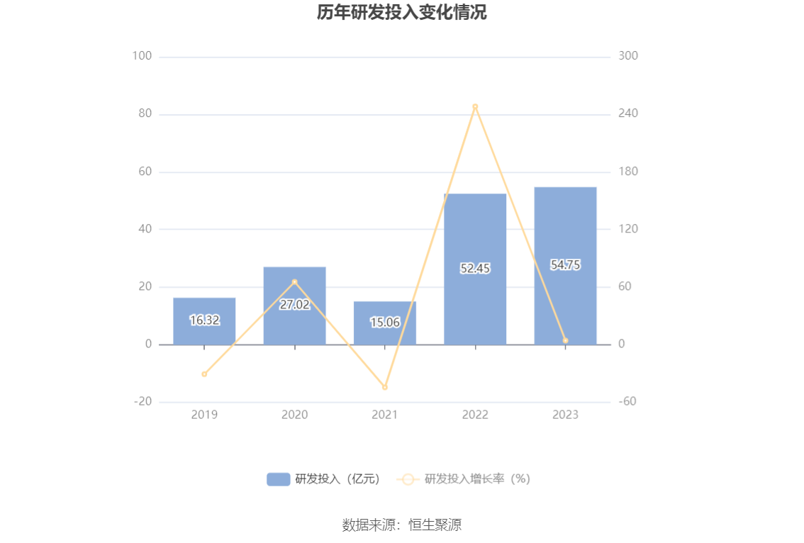 2023年全年,公司研发投入金额为54.75亿元,同比增长4.39%;研发投入占营业收入比例为1.30%,相比上年同期上升0.06个百分点。此外,公司全年研发投入资本化率为24.50%。