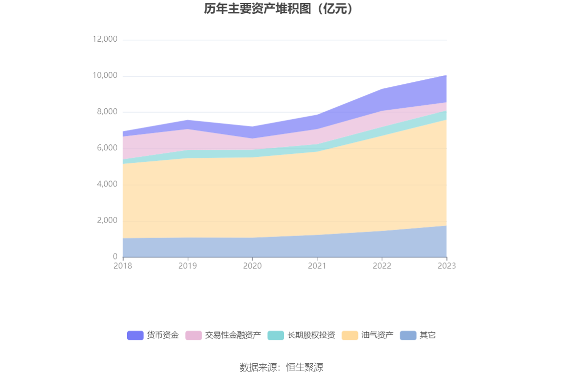 资产重大变化方面,截至2023年年末,公司交易性金融资产较上年末减少49.77%,占公司总资产比重下降5.08个百分点;其他非流动资产较上年末增加225.87%,占公司总资产比重上升2.63个百分点;货币资金较上年末增加24.03%,占公司总资产比重上升1.90个百分点;油气资产较上年末增加11.38%,占公司总资产比重上升1.64个百分点。