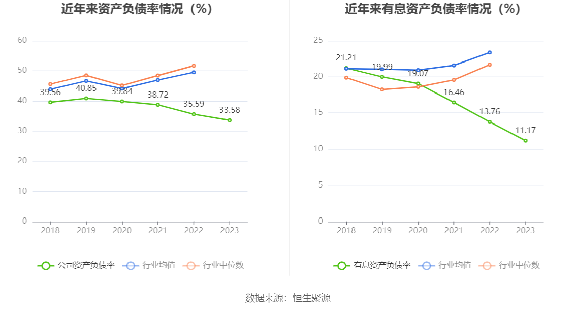在偿债能力方面,公司2023年年末资产负债率为33.58%,相比上年末下降2.01个百分点;有息资产负债率为11.17%,相比上年末下降2.59个百分点。