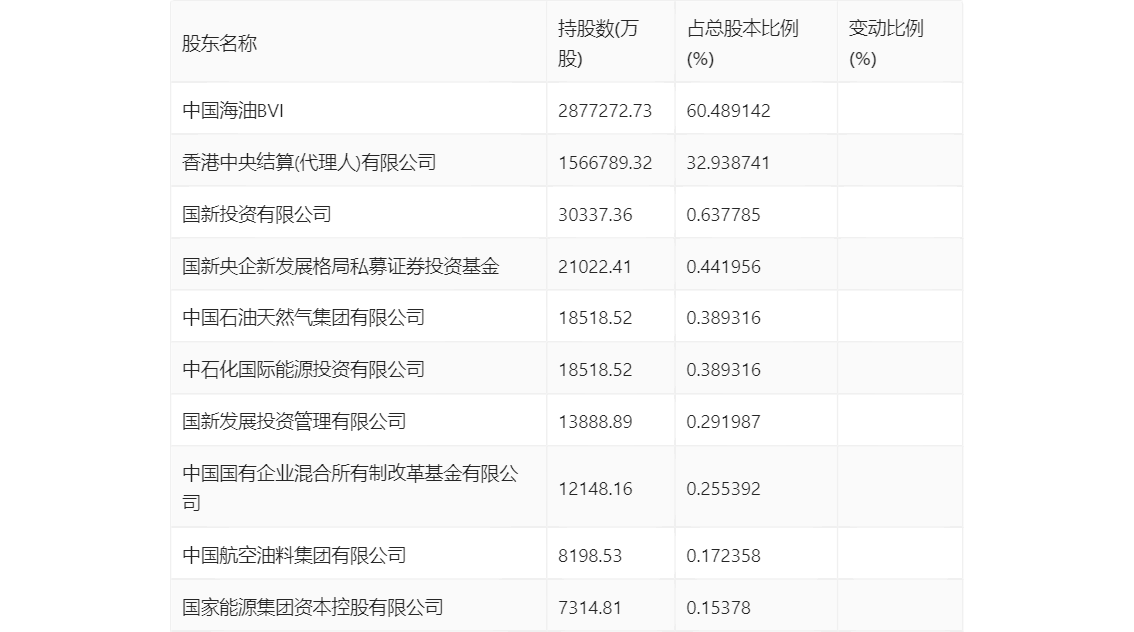 年报显示,2023年年末公司十大流通股东中,新进股东为中国海油BVI、国新央企新发展格局私募证券投资基金、中石化国际能源投资有限公司,取代了三季度末的中国海洋石油(BVI)公司、中国石化集团资产经营管理有限公司、全国社保基金一零九组合。在具体持股比例上,香港中央结算(代理人)有限公司、国新投资有限公司、国新发展投资管理有限公司持股有所上升,中国国有企业混合所有制改革基金有限公司持股有所下降。