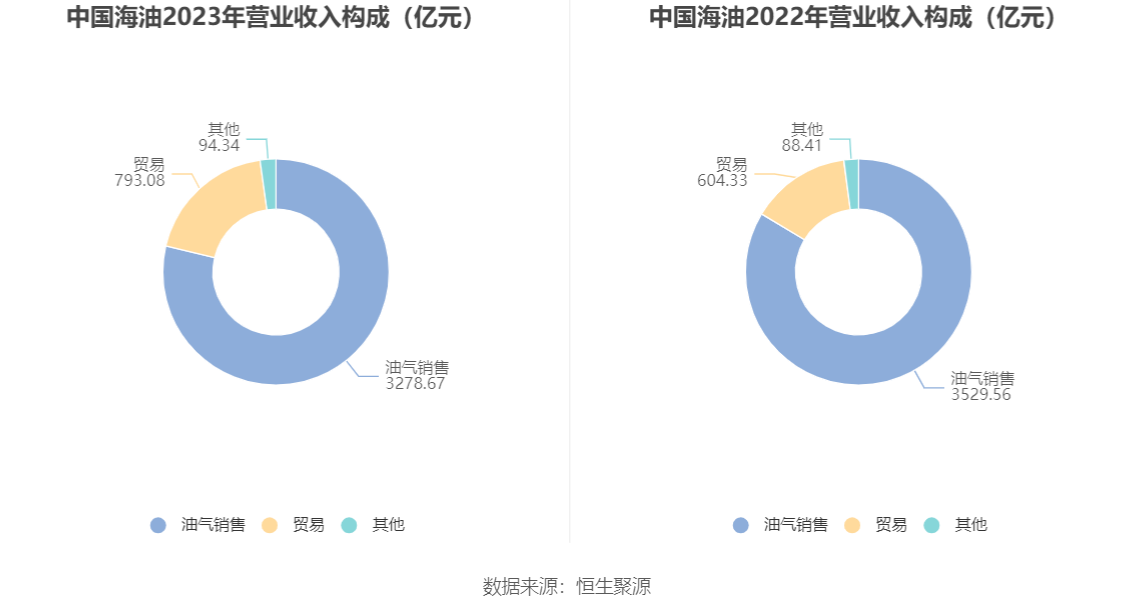 分产品来看,2023年公司主营业务中,油气销售收入3278.67亿元,同比下降7.11%,占营业收入的78.70%;贸易收入793.08亿元,同比增长31.23%,占营业收入的19.04%。