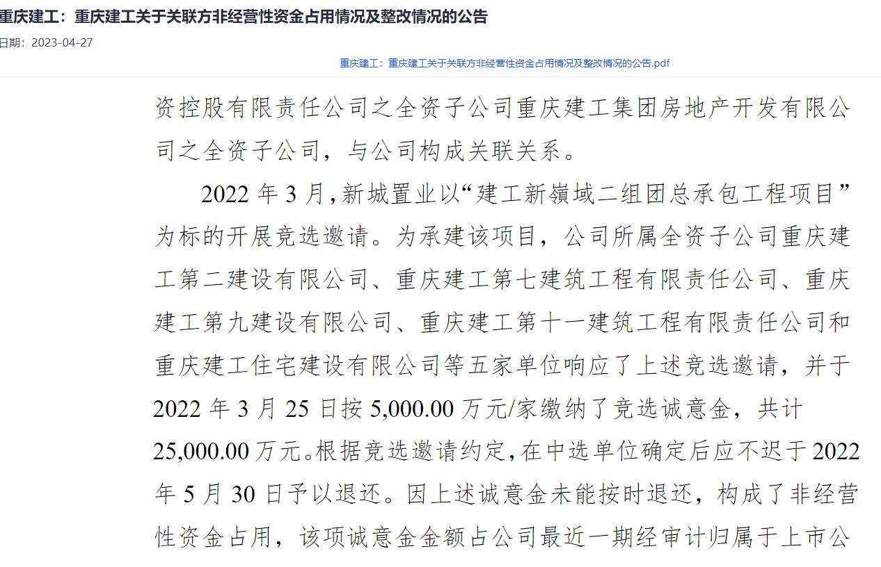 2023年4月26日,重庆建工发布《关于关联方非经营性资金占用情况及整改情况的公告》显示,2022年3月,控股股东子公司新城置业以“建工新嶺域二组团总承包工程项目”为标的开展竞选邀请。为承建该项目,重庆建工五家全资子公司响应了上述竞选邀请,并于2022年3月25日按5000万元/家缴纳了竞选诚意金,共计2.5亿元。根据约定,在中选单位确定后应不迟于2022年5月30日予以退还,因上述诚意金未能按时退还,构成了非经营性资金占用。