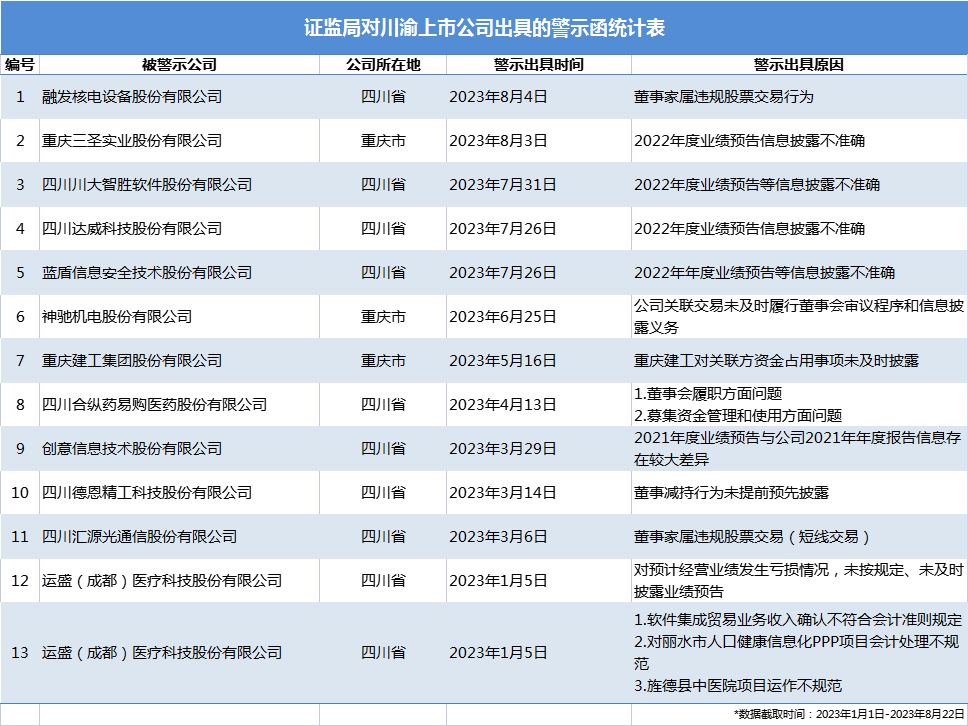 据中国证券监督管理委员会四川监管局、重庆监管局公开数据显示,截至2023年8月21日,川渝地区共有12家上市公司(包含重庆建工)收到了证监局的警示函。如下图所示:
