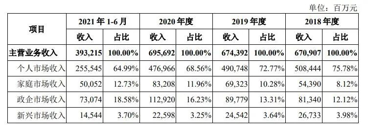 招股书显示,今年上半年,中国移动四大主营业务中,个人市场贡献了 3932 亿元的收入,占总营收的 65%。而在个人市场中,流量资费是其中的大头。