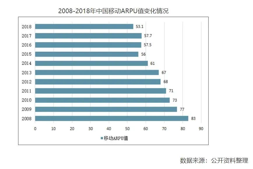 从 3G 开始,中国移动的 ARPU 便一直呈下降趋势,即使偶有回升幅度也并不大。到 2013 年 4G 正式商用,4G 网络普及的头两年,中国移动的 ARPU 也随之下降了 11 元,降幅达 16.4%。