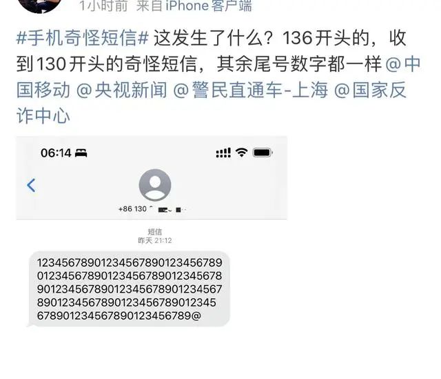 据央视新闻报道,昨日晚间开始,有不少网友反映,收到“奇怪的短信”。短信内容是一连串“1234567890”的重复数字,收到奇怪短信有136、137号段;发送方则基本都是130号段,且与136号段的号码差别很小;不少网友称后8位都相同,换言之,两个号码仅有一个数字的差别。