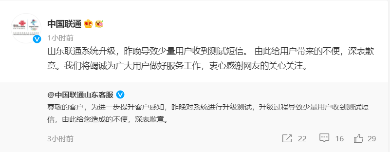 此外,中国联通在官方微信也进行了回应:山东联通系统升级,昨晚导致少量用户收到测试短信。由此给用户带来的不便,深表歉意。我们将竭诚为广大用户做好服务工作,衷心感谢网友的关心关注。