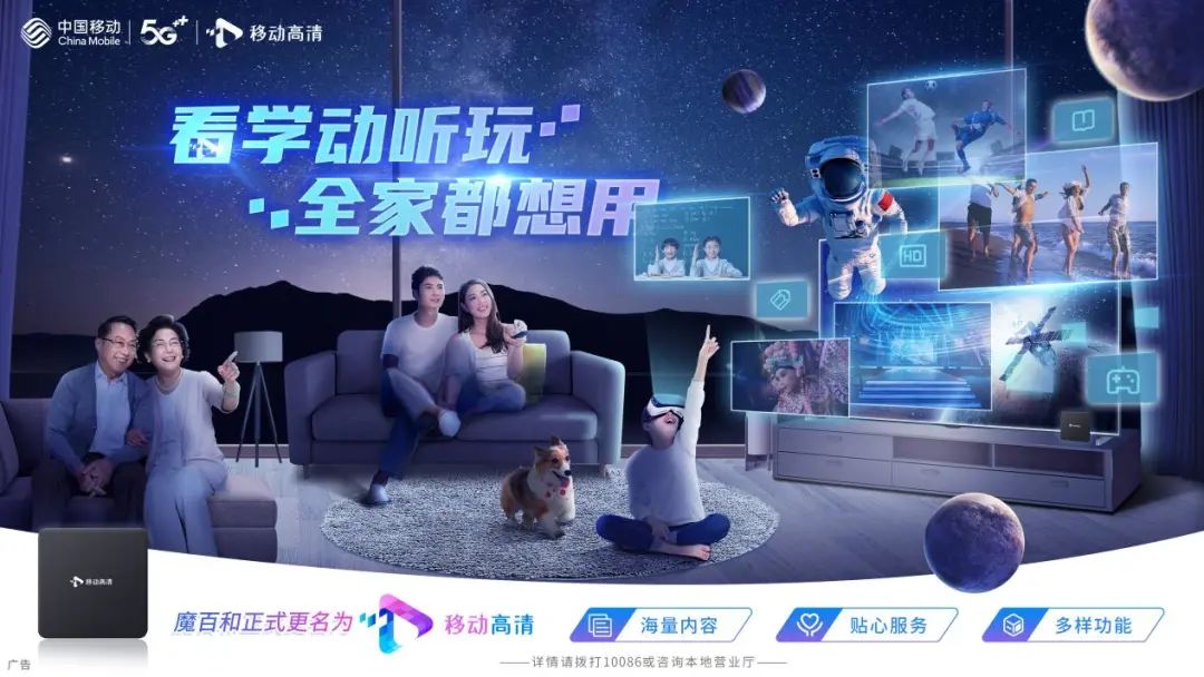 小客厅大生活,移动高清将继续秉持“看学动听玩,全家都想用”的服务理念,以标准化、常态化、数智化的运营手段,坚守大屏文化阵地,筑牢意识形态基石,持续优化产品内容,提升服务体验,拓展应用场景,为用户提供全新的家庭视听互动娱乐体验。