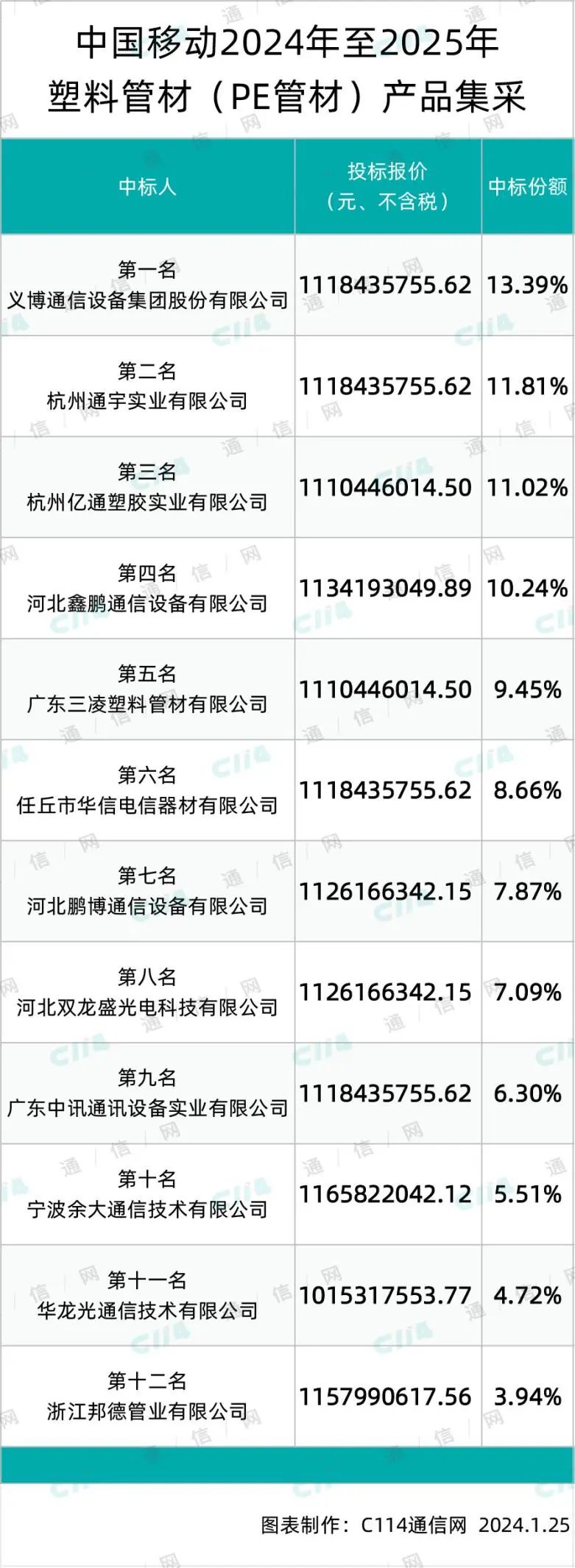 C114讯 1月25日消息(焦焦)从中国移动官网获悉,中国移动日前公示了2024年至2025年塑料管材(PE管材)产品的集采结果,义博、通宇、亿通、鑫鹏等12家中标。