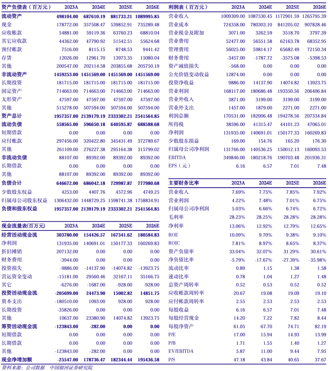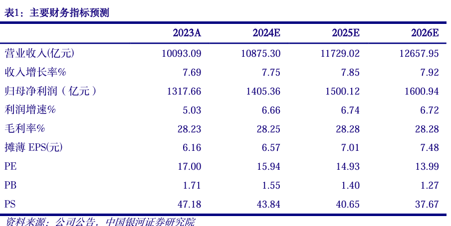 公司23年派息率为71%,有望在三年内达75%以上。我们看好公司长期业绩增长空间,结合公司最新业绩情况,我们给予公司2024-2026年归母净利润预测值为1405.36亿元、1500.12亿元、1600.94亿元,对应EPS为6.57元、7.01元、7.48元,对应PE为15.94倍、14.93倍、13.99倍,维持“推荐”评级。