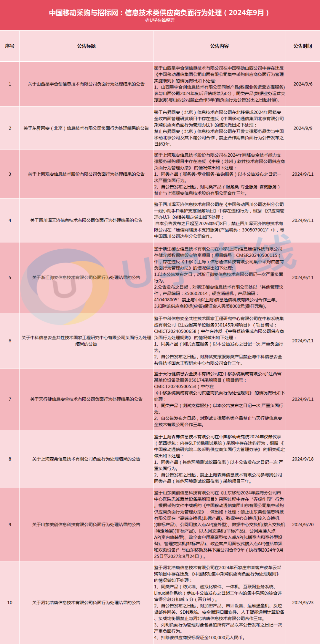 2024年9月以来,我们以中国移动这家最大的运营商为视角,收集了中国移动“信息技术”类供应商在这方面的公告信息,截至9月23日,据不完全统计,共有10则负面行为处理结果公告在列,具体如下: