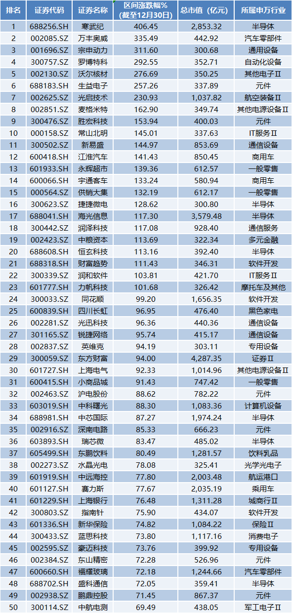 iFinD数据显示,截至12月30日,剔除今年上市新股、次新股,选取总市值在300亿以上的个股涨幅排名显示,寒武纪以406.45%的涨幅排名第一,万丰奥威、宗申动力紧随其后,涨幅分别达到335.49%、311.60%。