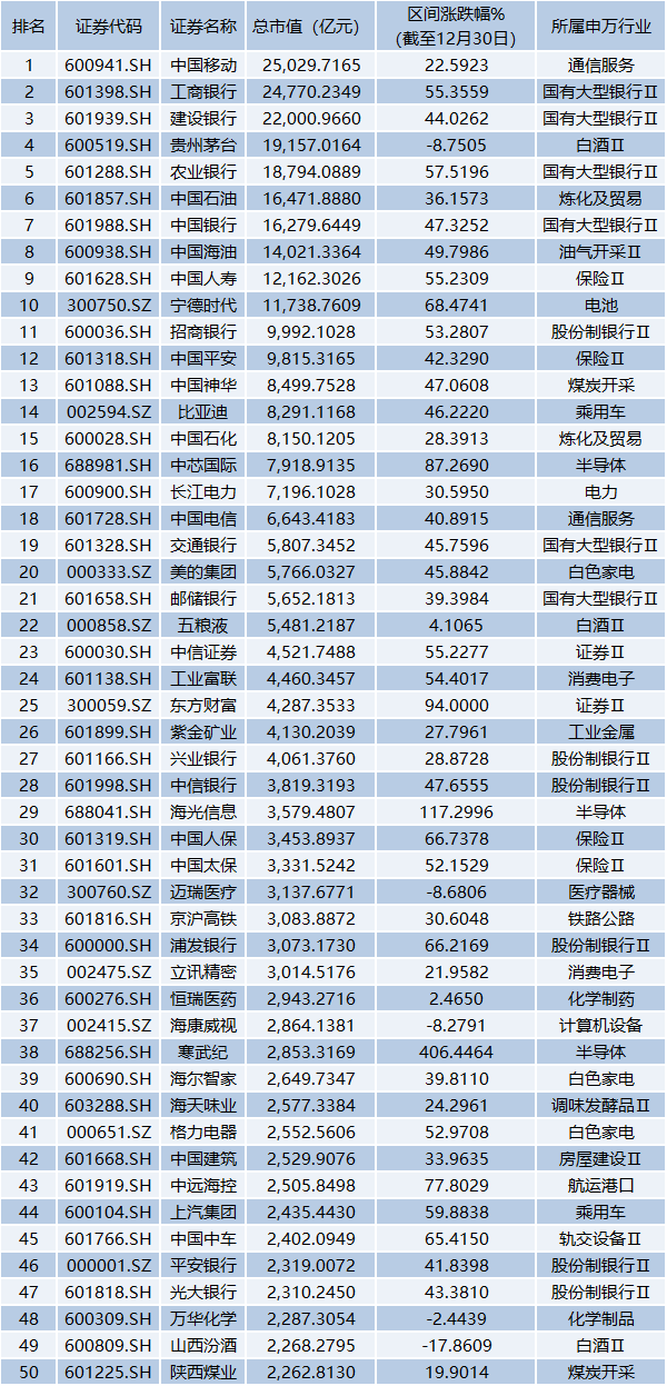 从市值来看,截至12月30日,中国移动以2.5万亿市值排名榜首,工商银行、建设银行分列二三位,曾经的“股王”贵州茅台已滑落至第四位。