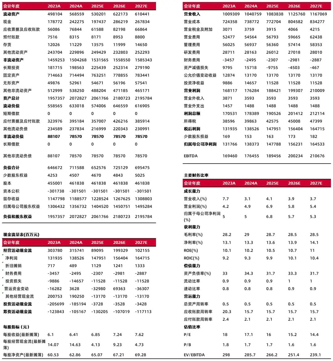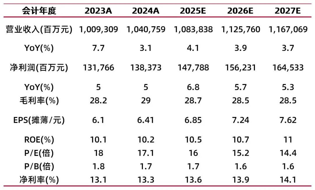 盈利预测、估值分析和投资建议:预计公司2025-2027年归母净利润1477.88/1562.31/1645.33亿元,同比增长6.8%/5.7%/5.3%;对应EPS为6.85/7.24/7.62元,2025年04月11日收盘价对应PE分别为16.0/15.2/14.4倍,一方面公司将继续保持业绩稳健增长,另一方面分红率进一步提升,与国际主流运营商对比估值仍有提升空间,维持“买入-A”评级。