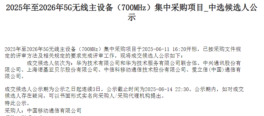 700MHz成交候选人依次为:华为技术有限公司和华为技术服务有限公司联合体、中兴通讯股份有限公司、上海诺基亚贝尔股份有限公司、中信科移动通信技术股份有限公司、爱立信(中国)通信有限公司。
