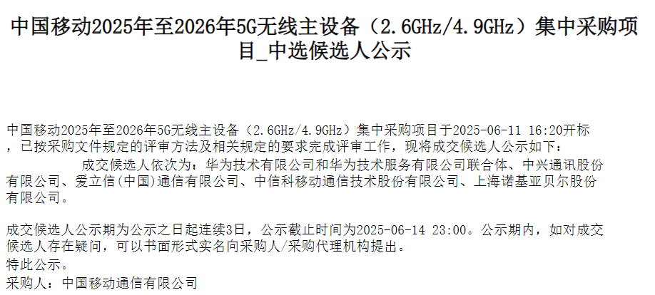 昨日,中国移动公布了5G无线主设备2.6GHz/4.9GHz项目和700MHz项目两项集采约40万站的中选候选人,华为、中兴通讯、爱立信、中信科移动、上海诺基亚贝尔等五家企业中标!