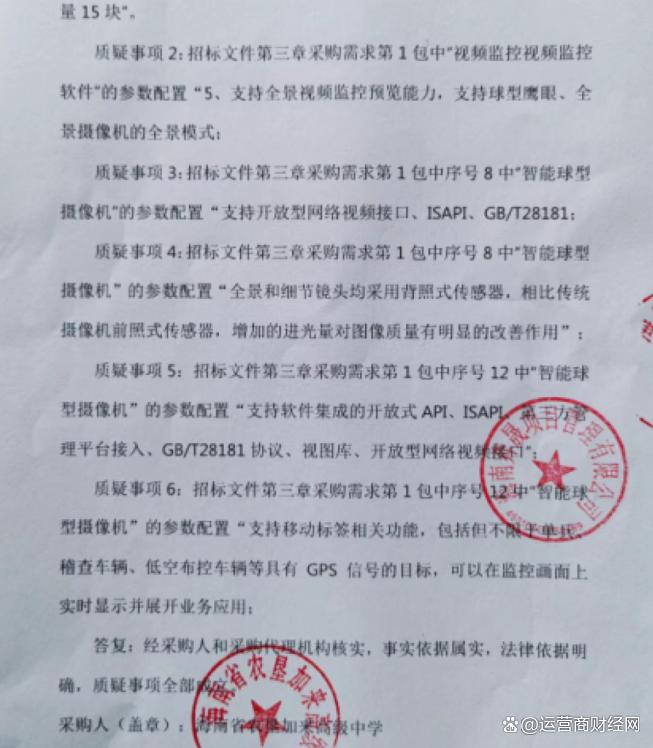 原本以为该项目招标到此结束,然而就在中国移动中标后,作为该项目推荐排名第二的海南当地一家企业直接对该项目进行了投诉。其提出了共计6项质疑,涉及“视频综合平台”“视频监控软件”及“智能球型摄像机”的配置要求。