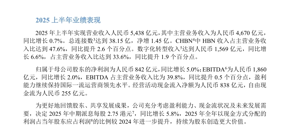同日,中国移动发布公告称,决定向全体股东派发截至2025年6月30日止六个月之中期股息每股2.75港元(含税),同比增长5.8%。
