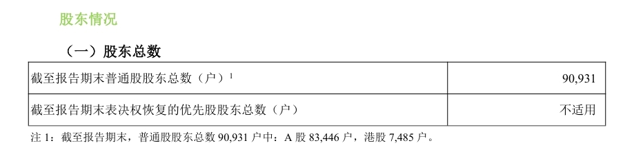 截至报告期末,公司普通股股东总数为90,931户,其中A股83,446户,港股7,485户。