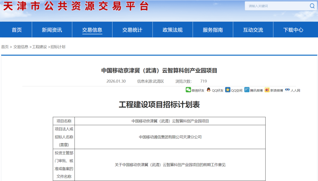 2026年1月30日,天津市公共资源交易平台发布中国移动京津冀(武清)云智算科创产业园项目招标计划。