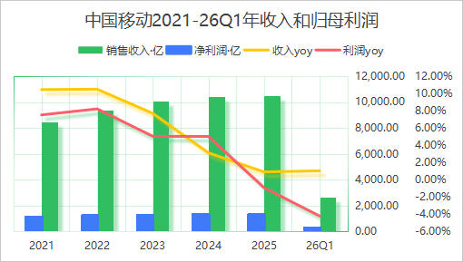 中国移动2026Q1业绩基本符合预期,营收2665亿,增速放缓至+1.0%,归母净利润293亿,同比-4.2%,主要受增值税税目调整及传统通信业务承压影响,最终还是公司承担了税目调整的影响,没有转嫁到消费者(提价)。