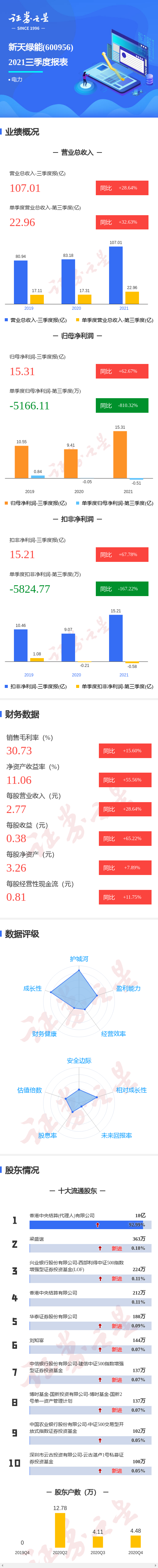 新天绿能2021三季报显示,公司主营收入107.01亿元,同比上升28.64%;归母净利润15.32亿元,同比上升62.67%;扣非净利润15.22亿元,同比上升67.78%;其中2021年第三季度,公司单季度主营收入22.97亿元,同比上升32.63%;单季度归母净利润-5166.12万元,同比下降810.32%;单季度扣非净利润-5824.77万元,同比下降167.22%;负债率71.43%,投资收益1.96亿元,财务费用8.65亿元,毛利率30.73%。