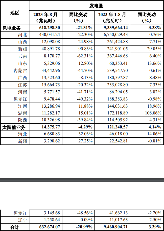 新天绿能9月8日公告,2023年8月,本公司及子公司按合并报表口径完成发电量63.27万兆瓦时,同比减少20.99%。截至2023年8月31日,累计完成发电量946.09万兆瓦时,同比增加3.39%。