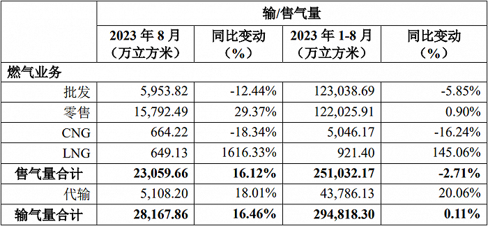 2023年8月,本公司及子公司按合并报表口径完成输气量2.82亿立方米,同比增加16.46%,其中售气量2.31亿立方米,同比增加16.12%;代输气量5108.2万立方米,同比增加18.01%。截至2023年8月31日,累计完成输气量29.48亿立方米,同比增加0.11%,其中售气量25.1亿立方米,同比下降2.71%;代输气量4.38亿立方米,同比增加20.06%。