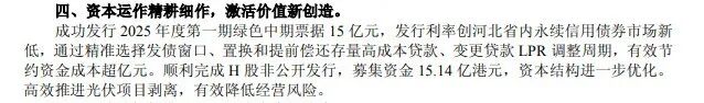 在资本运作方面,集团成功发行2025年度第一期绿色中期票据15亿元,发行利率创河北省内永续信用债券市场新低,通过精准选择发债窗口、置换和提前偿还存量高成本贷款、变更贷款LPR调整周期,有效节约资金成本超亿元。顺利完成H股非公开发行,募集资金15.14亿港元,资本结构进一步优化。高效推进光伏项目剥离,有效降低经营风险。