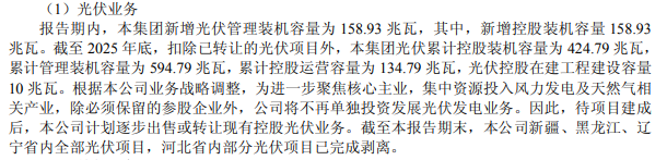 报告期内,本集团新增光伏管理装机容量为158.93兆瓦,其中,新增控股装机容量158.93兆瓦。截至2025年底,扣除已转让的光伏项目外,本集团光伏累计控股装机容量为424.79兆瓦,累计管理装机容量为594.79兆瓦,累计控股运营容量为134.79兆瓦,光伏控股在建工程建设容量10兆瓦。