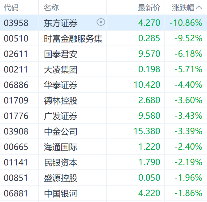 截止发稿,东方证券(03958.HK)跌10.86%、国泰君安(02611.HK)跌6.18%、华泰证券(06886.HK)跌4.22%。
