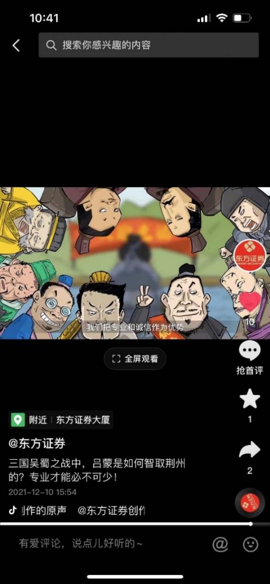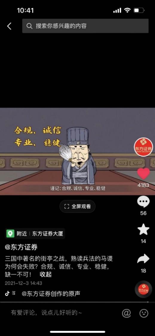 随着抖音、视频号等短视频平台的快速发展,以及受众阅读习惯和信息获取来源的变化,为了让证券行业文化建设拥有更大的传播平台及更多受众,东方证券结合新媒体平台特点,以“合规、诚信、专业、稳健”为关键词,以三国典故为背景,创作了“三国系列”短视频并在官方抖音号、视频号等渠道投放,在寓教于乐的同时积极践行和传播行业文化。