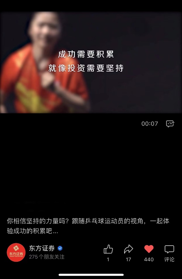 东方证券结合公司长期投资、价值投资等品牌特色,以坚持、积累、等待等关键词,借助当下年轻人喜欢的美食、体育、艺术等元素,拍摄了多条适合新媒体平台的短视频,在传播美好和正能量的同时,也向投资者传递了科学、理性的投资观,积极助力行业文化建设及整体发展。