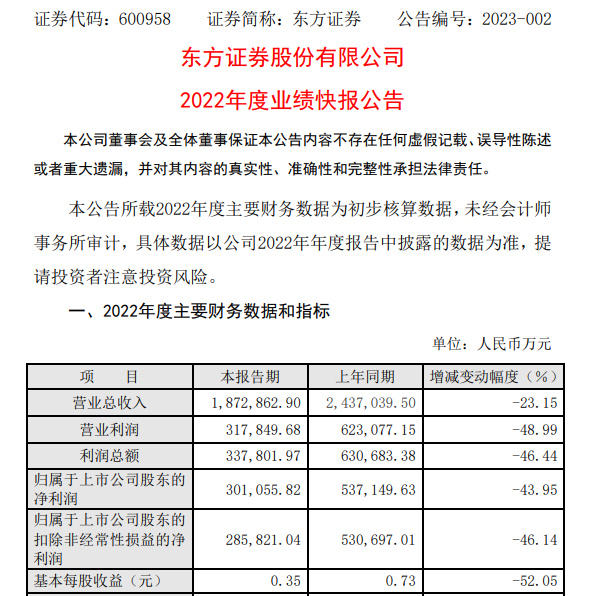 近日,东方证券发布2022年业绩快报。公司营收及净利润均出现明显下降,其中净利润降幅同比超四成。